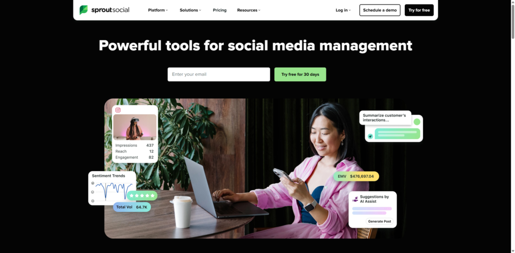 Sprout Social includes AI and automation features that help draft and improve post copy using its AI Assist options.