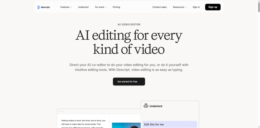 Descript is an AI video editor that lets you edit video by editing text, using an automatic transcription workflow.