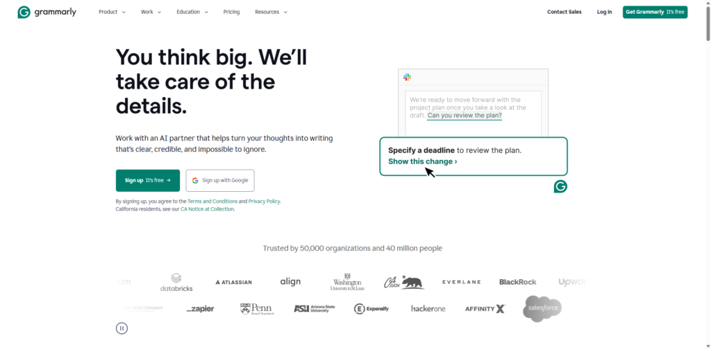 Grammarly is an AI-powered writing assistant that checks your grammar, spelling, punctuation, and style in real time. It goes beyond basic spell check by suggesting ways to make your writing clearer and more impactful.
